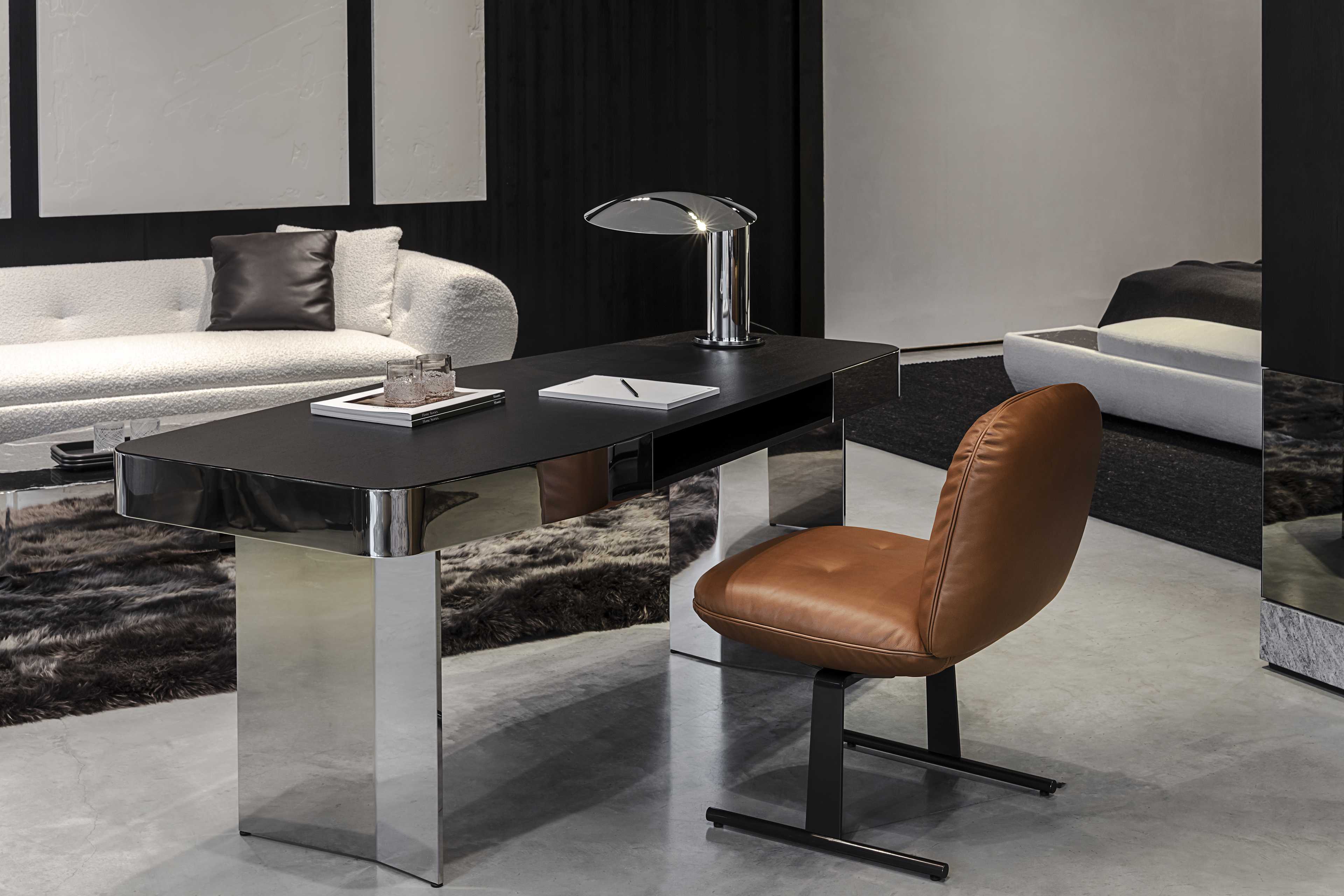 Basierend auf dem Prinzip der Beistelltischfamilie Diagramma entwickelte Giampiero Tagliaferri einen modernen Schreibtisch. Unregelmäßig und facettenreich in der Form, besticht er durch seine skulpturale Ästhetik: Zwei geschwungene Lamellen aus poliertem Edelstahl stützen ein Metallband, das sich um die Platten aus Santos-Palisander legt.