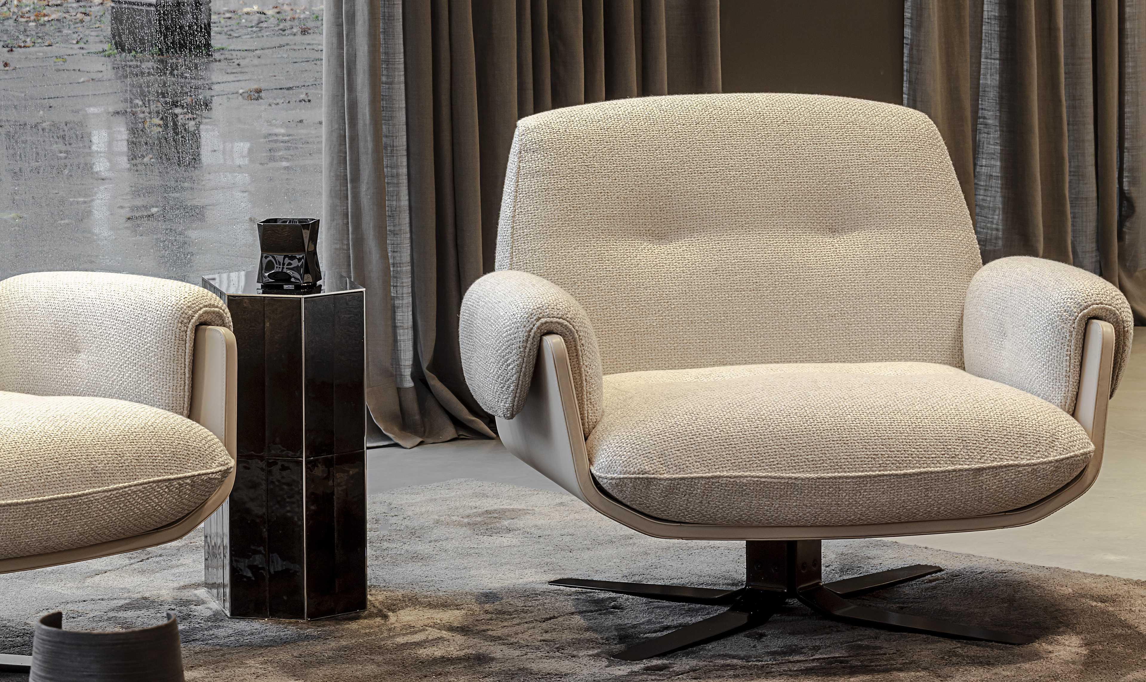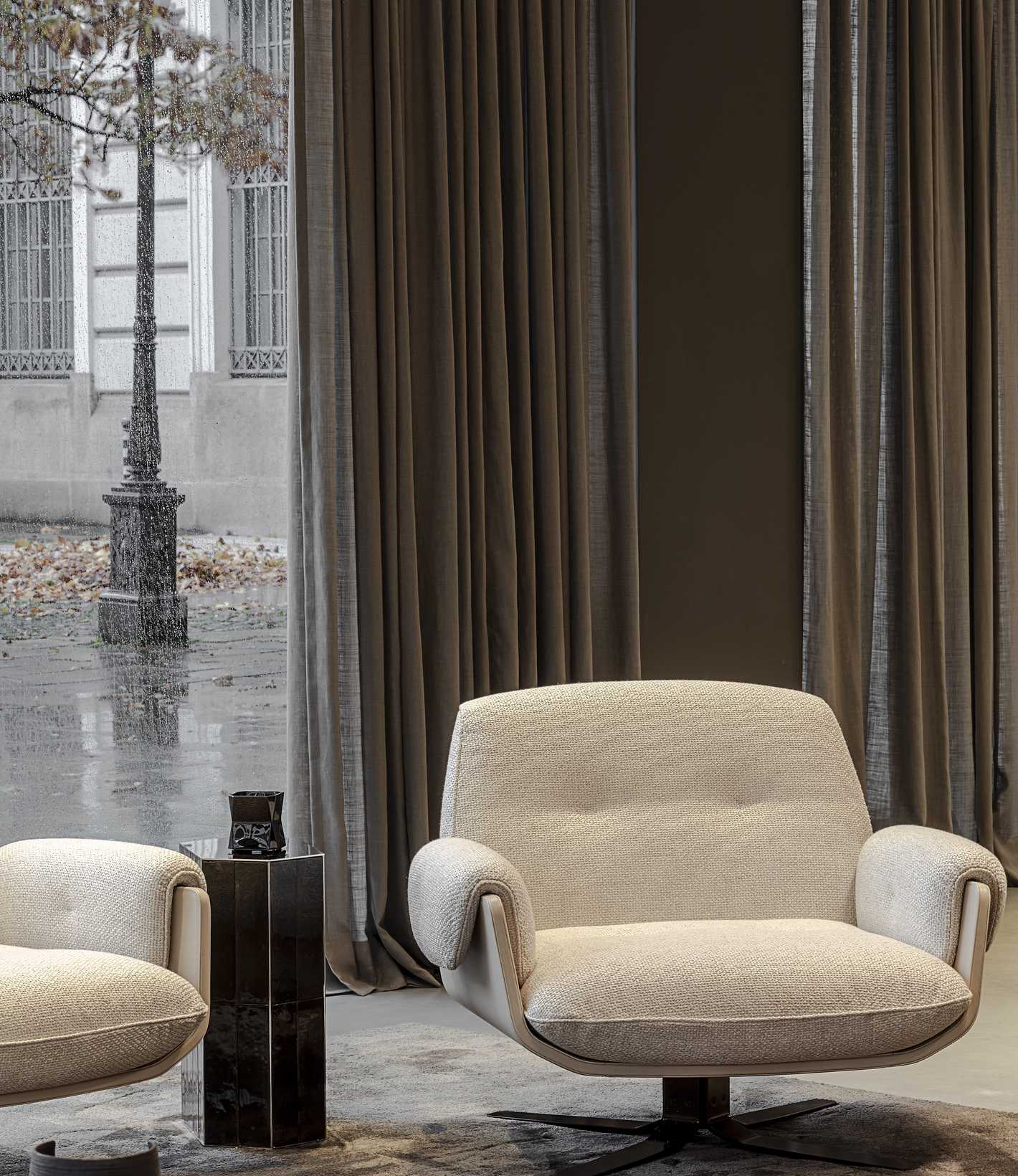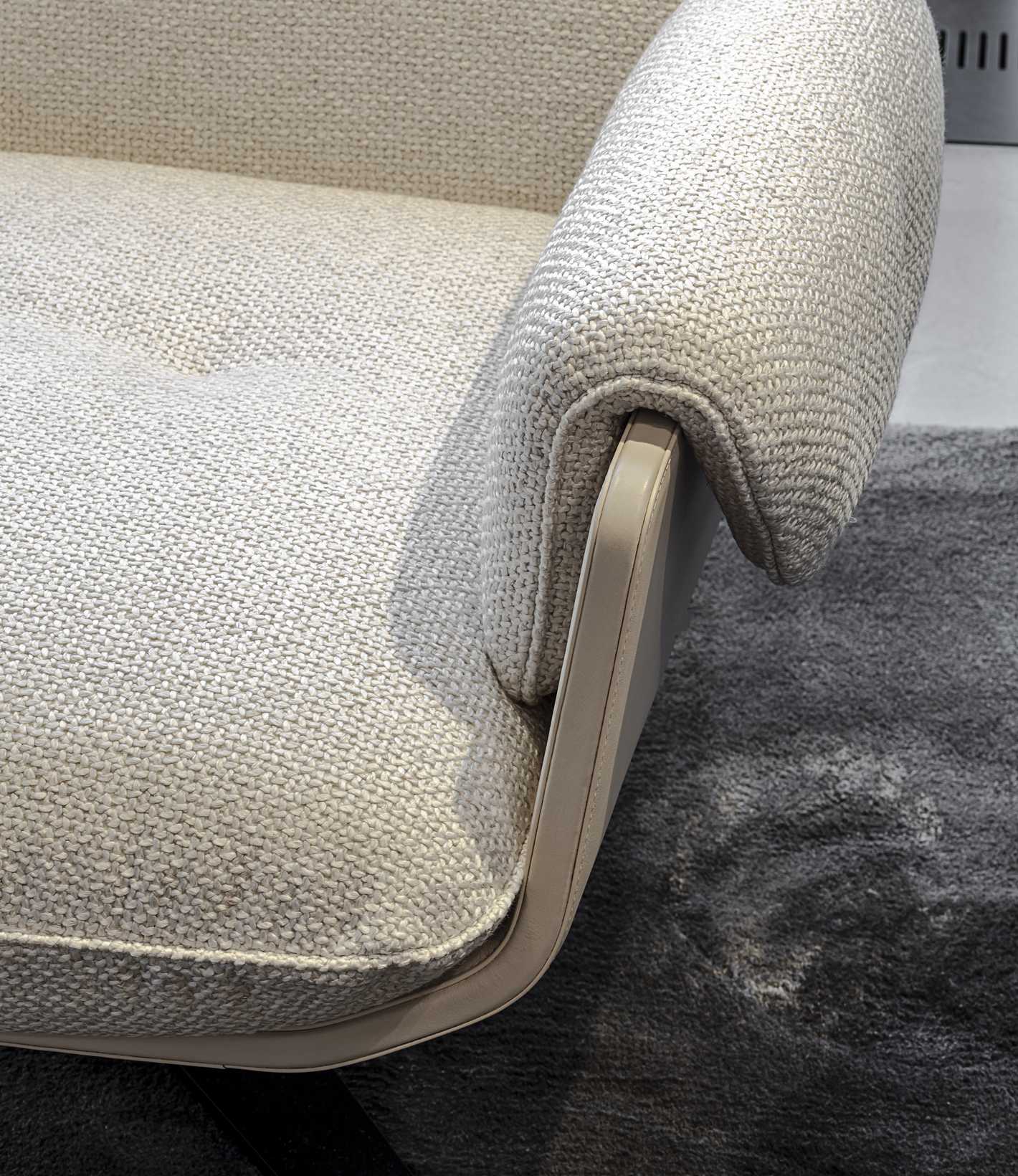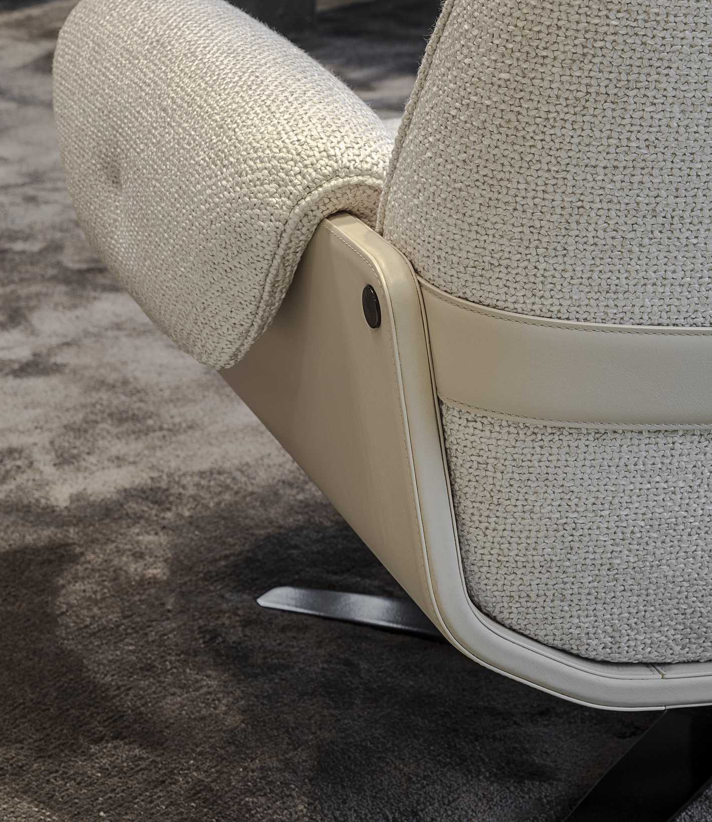 Die Sitzschale – erhältlich entweder in Holz oder mit einem Lederbezug - nimmt die Sitz- und Rückenkissen auf, die durch handwerkliche Steppnähte akzentuiert werden, und entwickelt sich auch seitlich nach oben, als Fundament für die weichen Armlehnen.