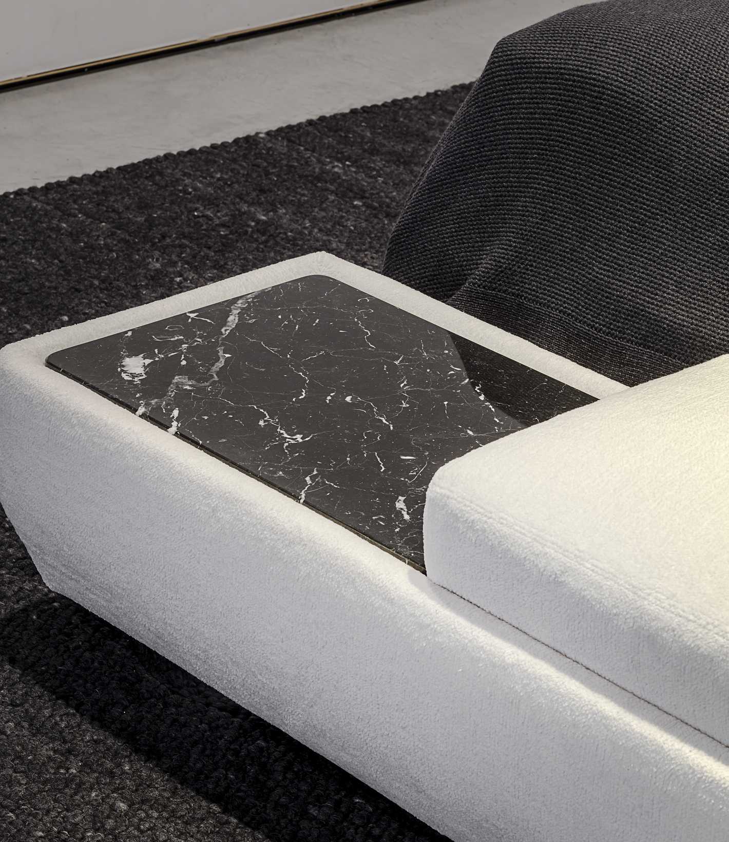 Die Gestaltung des Kopfteils des Bettes entspricht dem der Rücken- und Armlehnen der Sofaserie - das charakteristische Stilelement dieses Möbels und inspiriert von den Mondphasen. Das Sommier-Bett garantiert dank seiner zahlreichen integrierten Taschenfedern eine exzellente Schlafqualität.