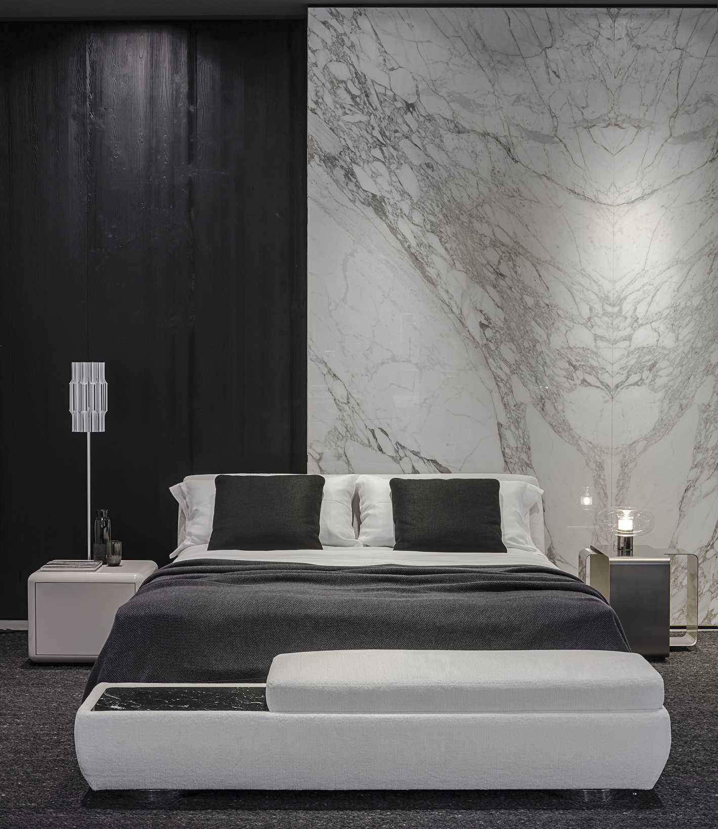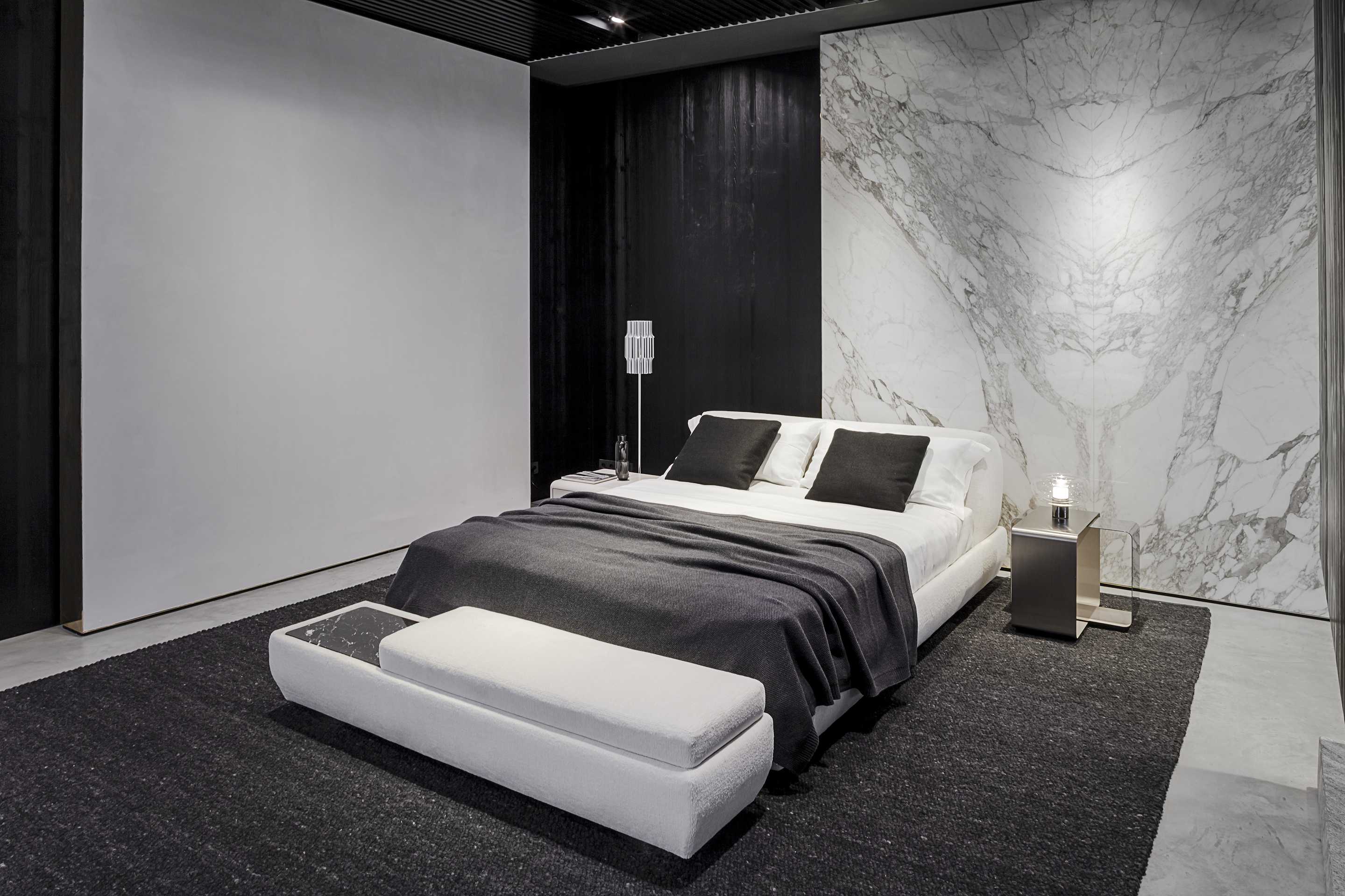 Die Idee des Supermoon Bettes entspricht dem des gleichnamigen Sitzprogramms und ist dem Ruhebereich gewidmet. Die Matratze ist in einem gepolsterten, profilierten Gestell untergebracht, das wiederum auf Edelstahl- oder Bronzescheiben liegt.