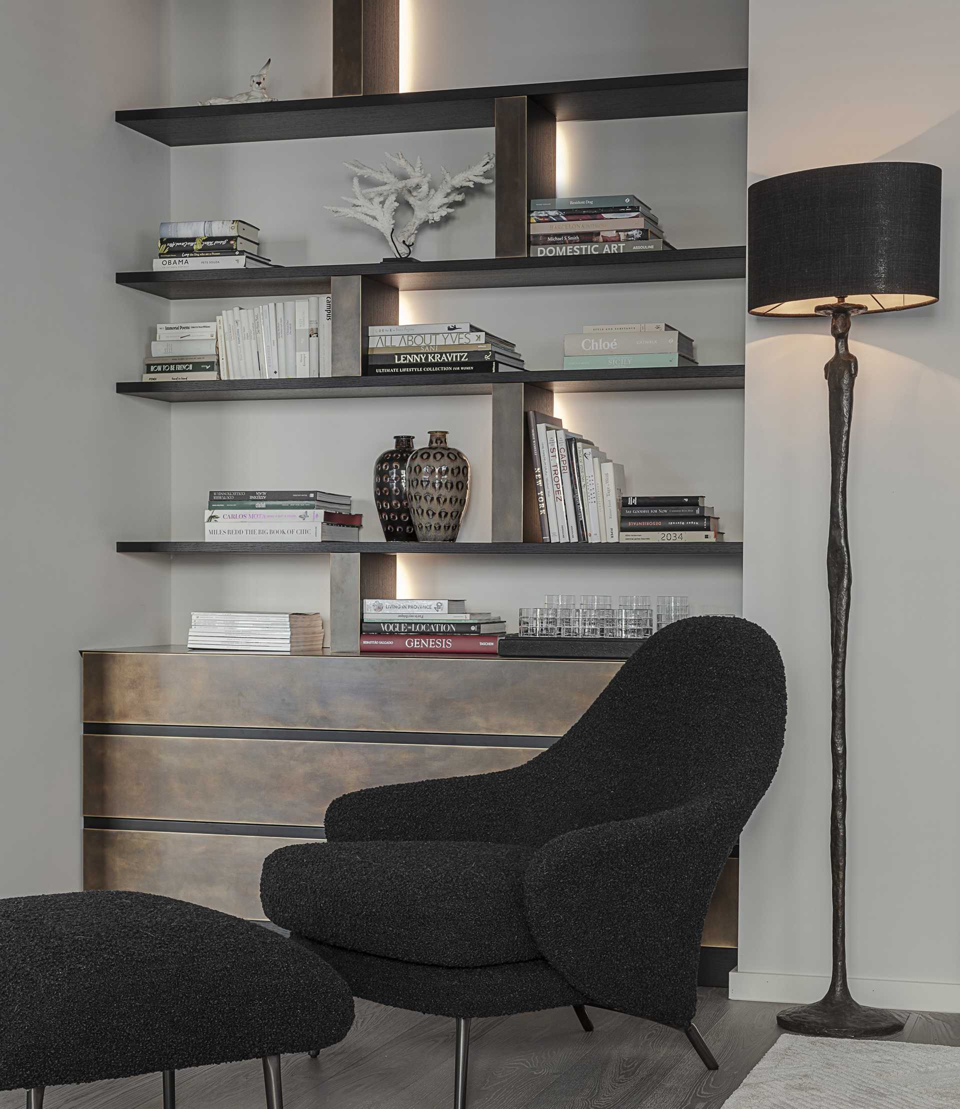 So wird Design zur Inszenierung: Samtweiche Dedar-Stoffsofas treffen auf reflektierende Glaswände, während schwarz geköhlte Eichenmöbel ihre kantige Eleganz über grau geölten Parkettböden entfalten – ein Tanz der Gegensätze, bei dem sich Härte und Weiche, Glanz und Matt elegant die Hand reichen.