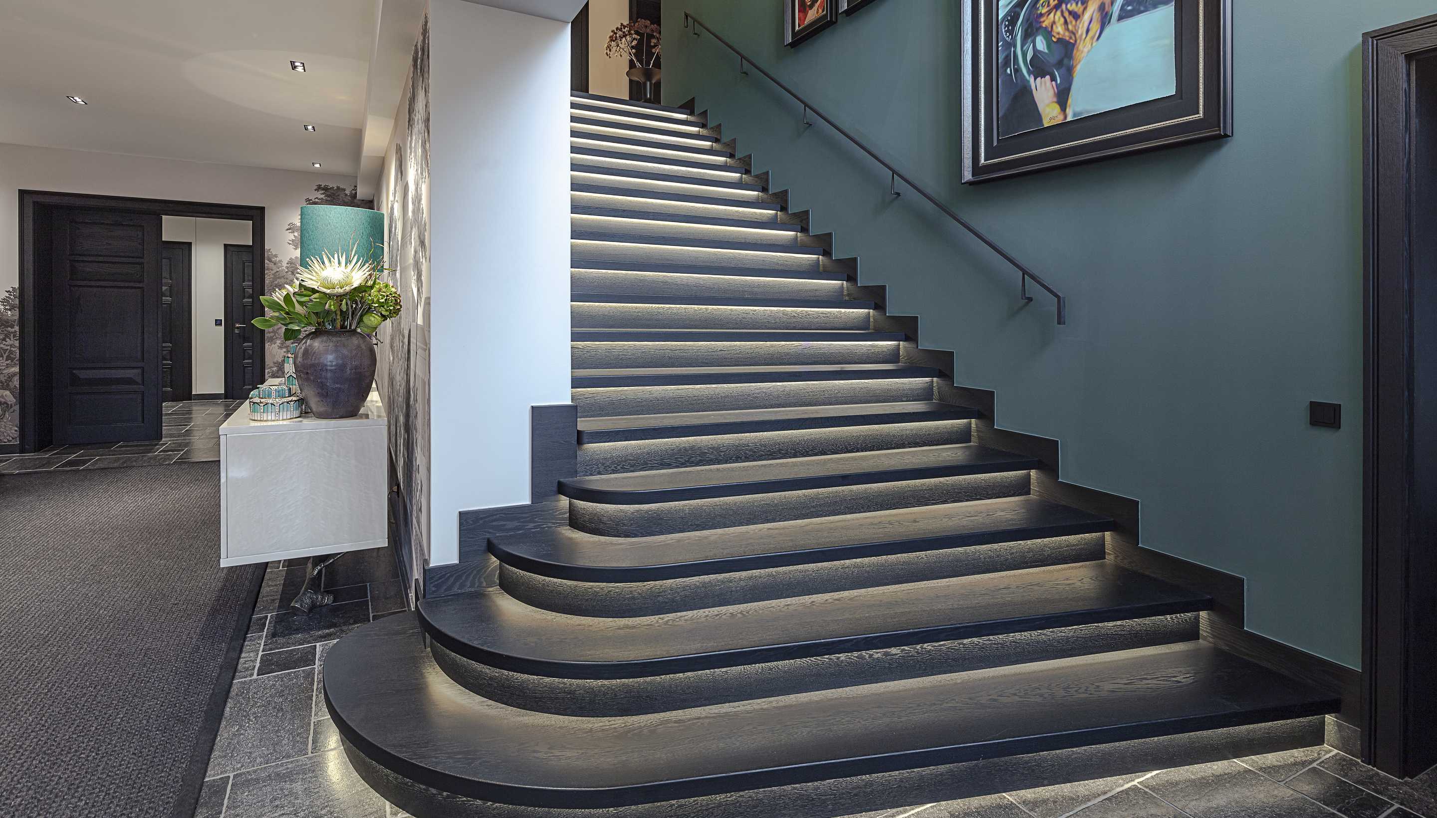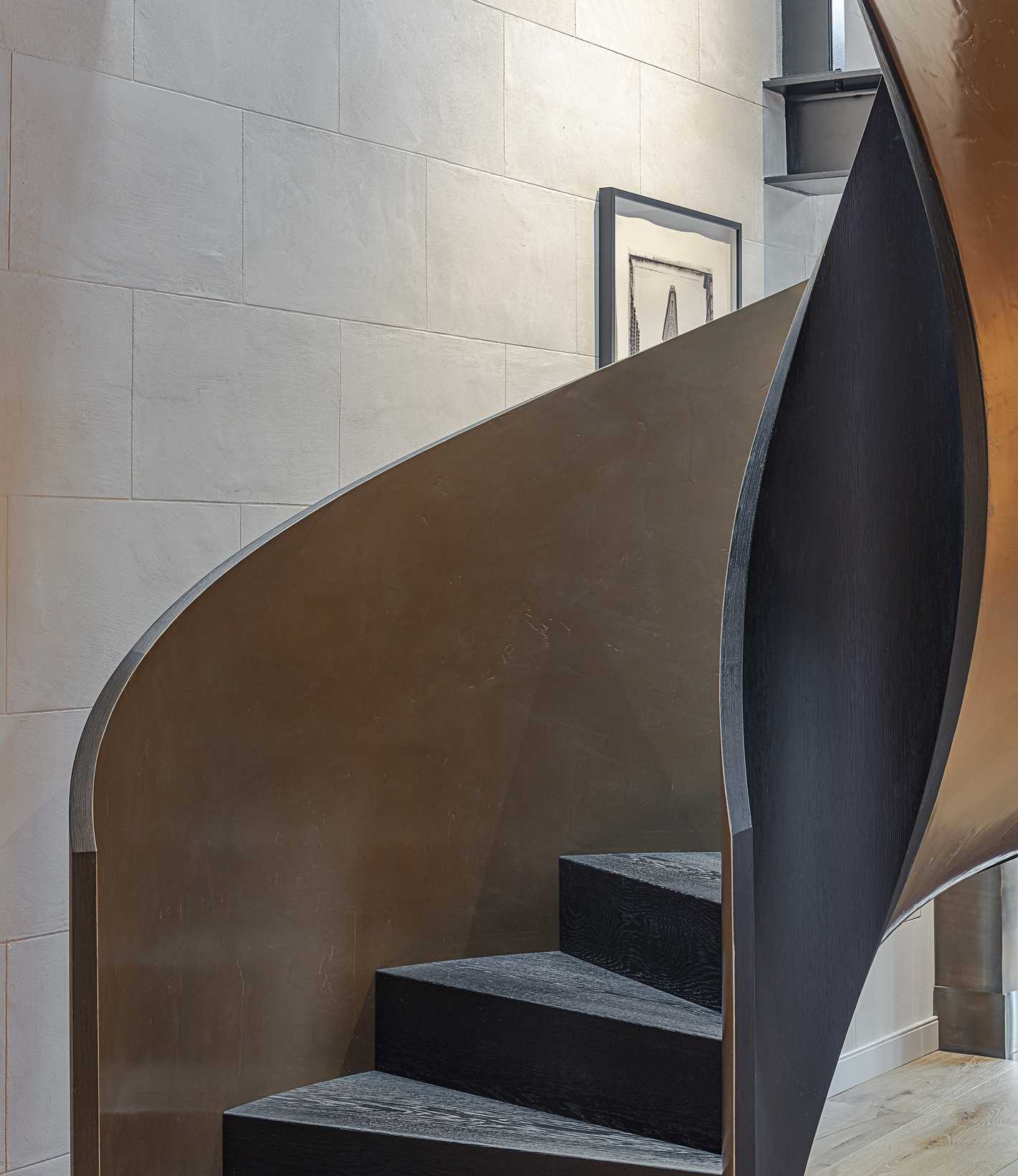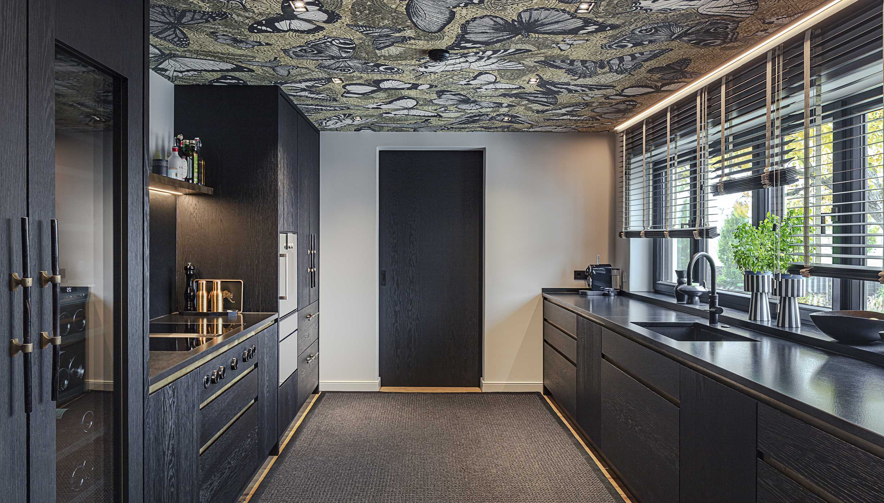 Im Zentrum des Hauses liegt der Wohn- und Essbereich – ein Ort der Begegnung, inspiriert von der Offenheit einer Reithalle. Rückzugsorte und Gemeinschaftsräume verschmelzen hier zu einer harmonischen Einheit. Dunkler Portoro-Marmor, eine maßgefertigte schwarze Eichenküche, tapezierte Decken, individuelle Steinbecken und handgearbeitete Esstische des Künstlers Stefan Knopp prägen die Atmosphäre. Jeder Raum wirkt wie eine Bühne, auf der Eleganz, Handwerk und Charakter vereint werden.