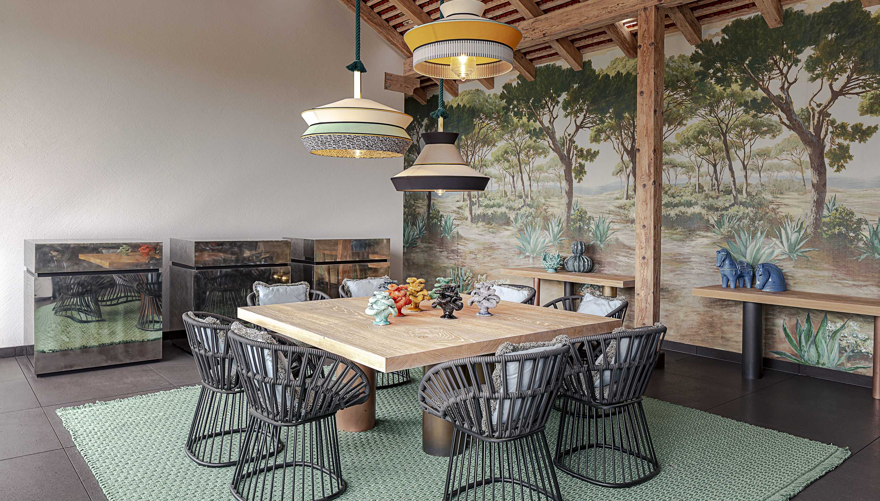 Das gesamte Projekt lebt von einem eklektischen Ansatz: Materialien, Farben und Texturen, die auf den ersten Blick kontrastreich erscheinen, fügen sich zu einem besonderen Gesamtkonzept. Altholz und Marmor zitieren Tradition, während Animal-Prints, florale Muster und markante Farbkontraste Spannung und Glamour erzeugen. Immer wieder erscheint das Pferd als zentrales Gestaltungselement – sei es als kunstvolle Leuchte, Silhouette oder Detail. Edelstahl und handwerkliche Akzente runden die mondäne Atmosphäre ab. Das Ergebnis: ein Wohnkonzept, das Vielfalt feiert, Trends überdauert und voller Charakter bleibt.